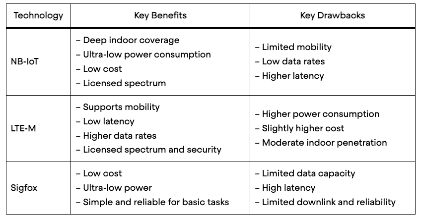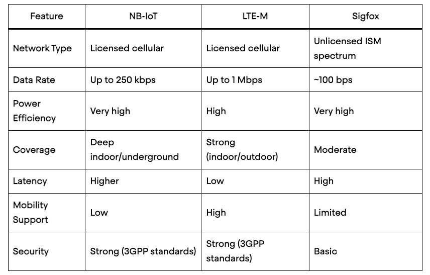 For quick reference, here’s a side-by-side comparison of NB-IoT, LTE-M, and Sigfox: