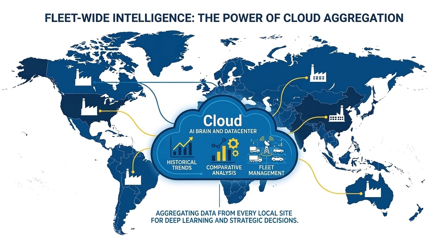 Cloud servers handle large-scale data aggregation, historical modeling and cross-site benchmarking.