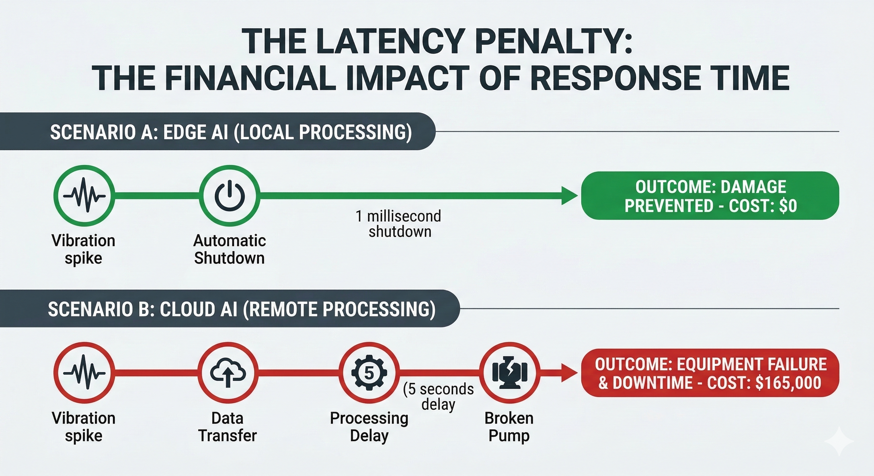 Quantifying this latency penalty also reveals severe financial consequences. For example, a delayed response to a failing pump bearing can escalate a simple five-part replacement into a catastrophic motor failure costing $45,000 in hardware and $120,000 in unplanned downtime. Instantly detecting the acoustic anomaly at its source can prevent cascading failure.
