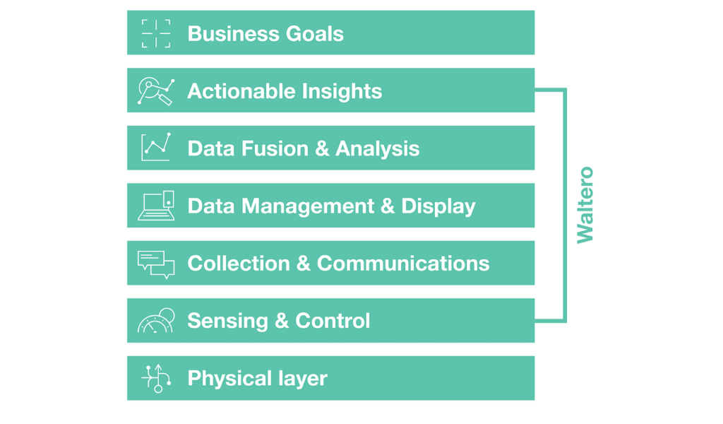 Transforming your metering systems into smart systems can be divided into 7 layers, ultimately helping your company reach your business goals. It’s however important to understand that just a smart meter isn’t enough to go all the way, per the model below. Installing a smart meter doesn’t add any business value, it’s about taking the next steps and integrating the new system with analyses and AI. Waltero’s solution does exactly this by covering six of seven stages of becoming digitized.