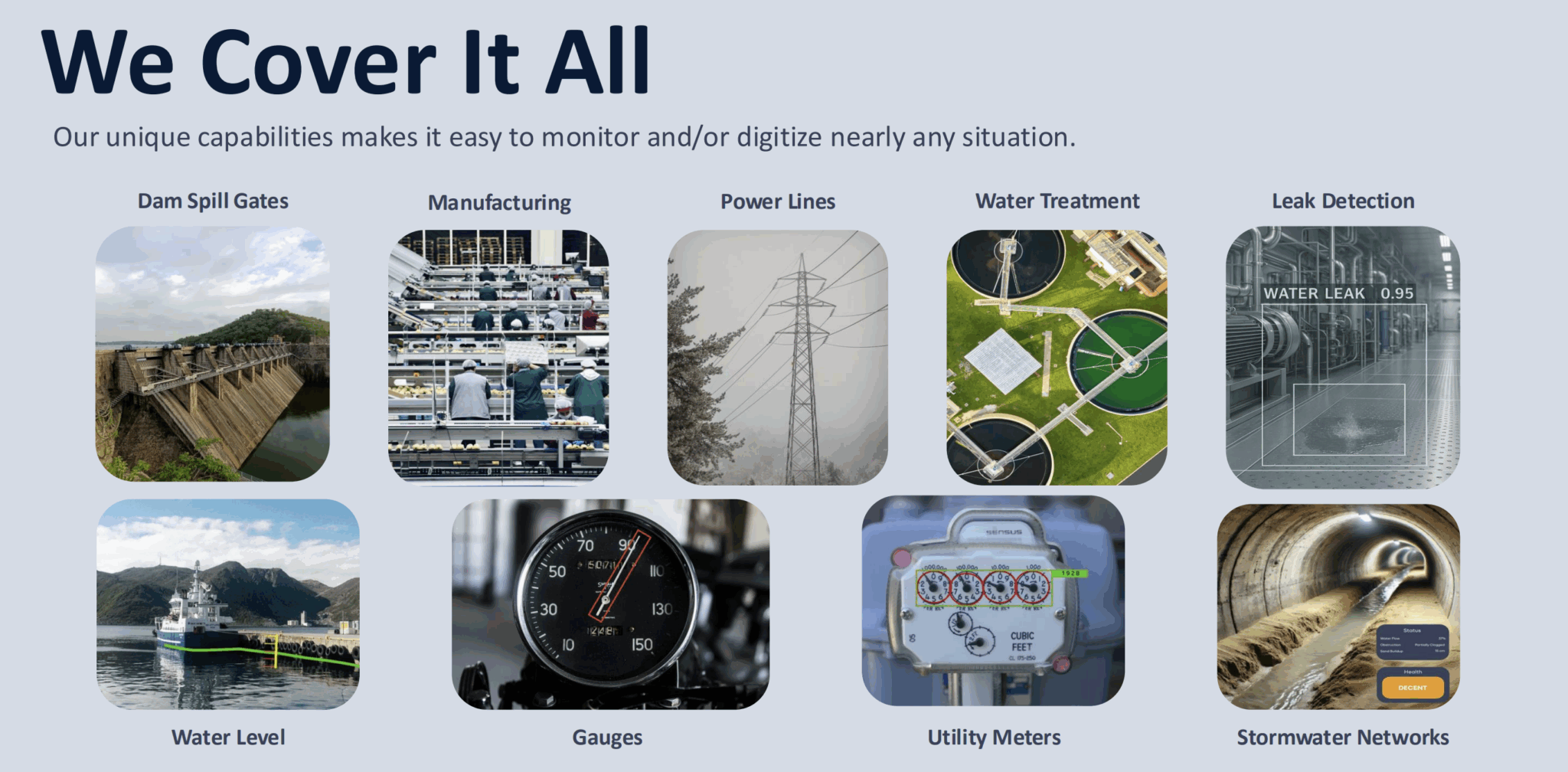 Many sensors are deployed in hazardous or otherwise inaccessible environments, digitizing utilities, businesses, and municipalities, as well as improving safety by reducing human exposure to risk while maintaining constant vigilance to workplace safety. This distributed intelligence effectively replaces periodic, manual checks with continuous, automated assurance of system integrity and performance.