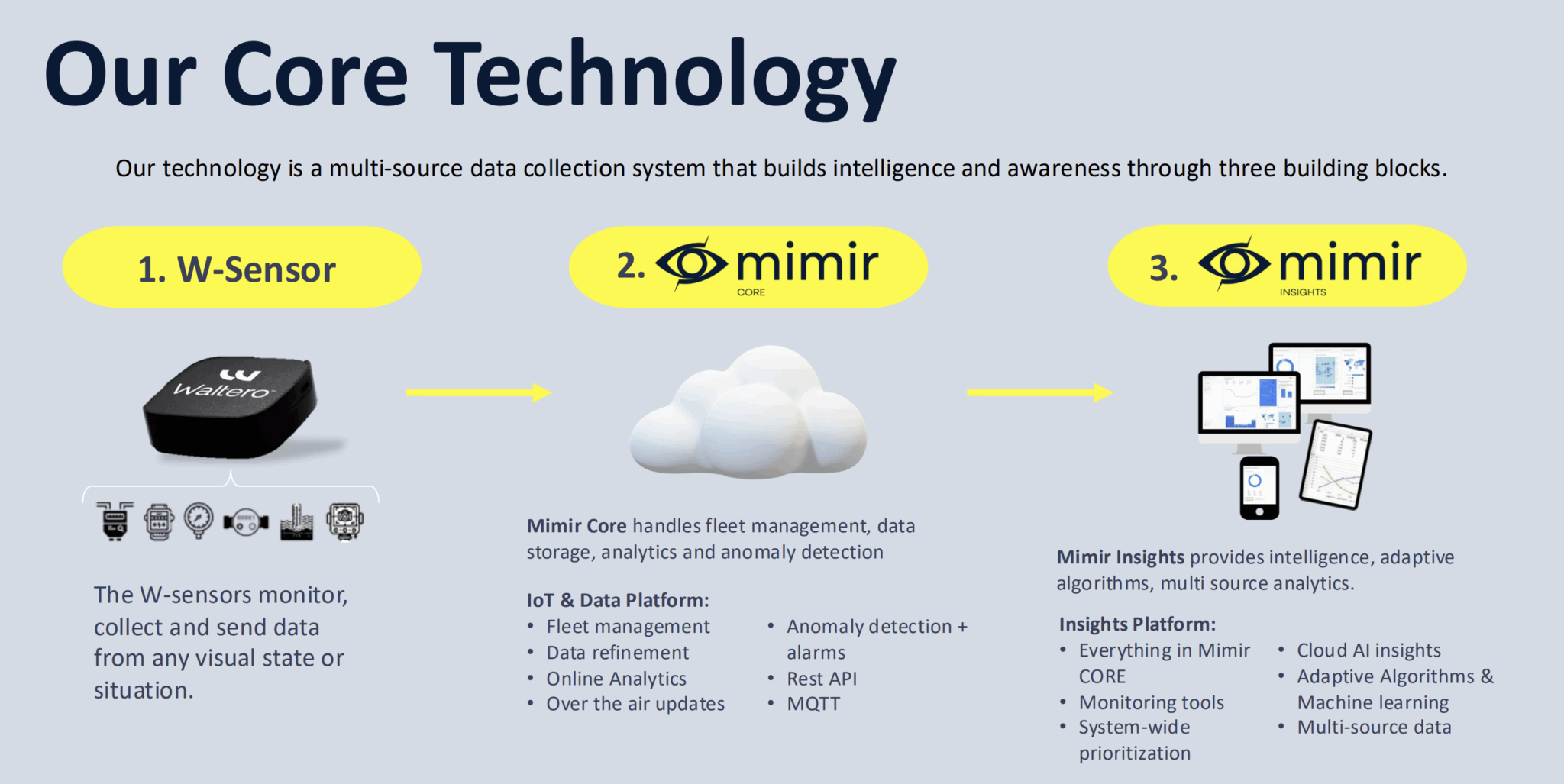 The intelligence behind these insights comes from Mimir, Waltero’s advanced cloud-based platform for data management, real time data processing, and data analytics. Mimir consolidates information from multiple W-Sensors and other IoT devices, applying AI-driven models to detect inefficiencies, predict equipment failures, and recommend optimal operating conditions. This capability, empowered with IoT asset tracking, enables teams to optimize operations, improve efficiency, and streamline maintenance workflows—delivering the benefits of real-time infrastructure monitoring to every facility.